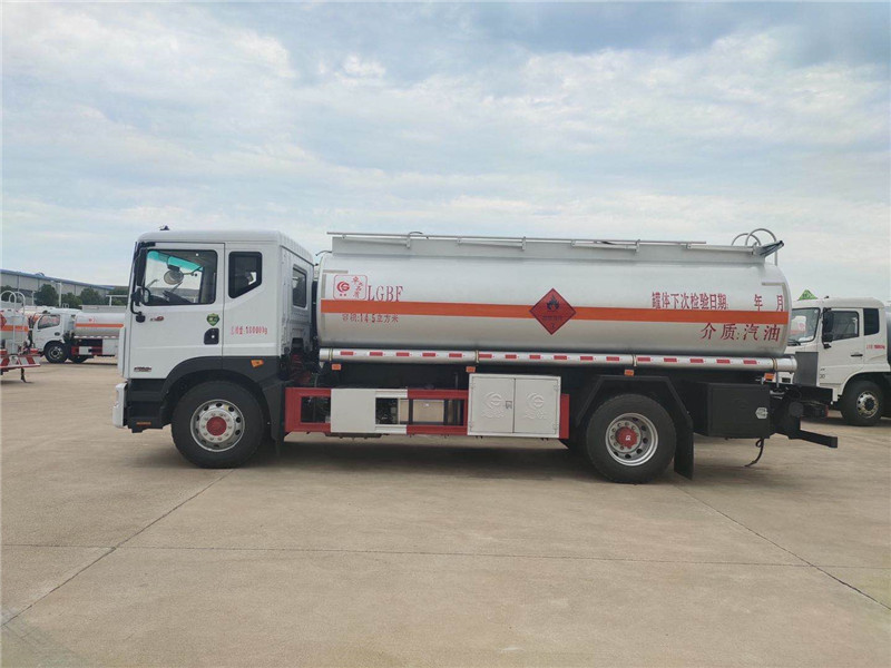 上装配置: 严格按照公告尺寸制作,罐体公告容积:14.5立方,实际容积15立方,上户吨位:9735KG,介质:汽油。单仓,罐体为碳钢制作,罐体厚度5mm(≧4.2mm),封头5mm(≧4.2mm)厚,带油车专用自吸自排泵,2个欧标罐口,1个海底阀,1个防溢流探杆,1个下装油口,1个油气回收接头,整车管道及球级出口为3寸,配一个防火帽,两根与罐体等长的输油管,两个灭火器,其余厂内标配。颜色:银粉,带3M反光标及反光带 。